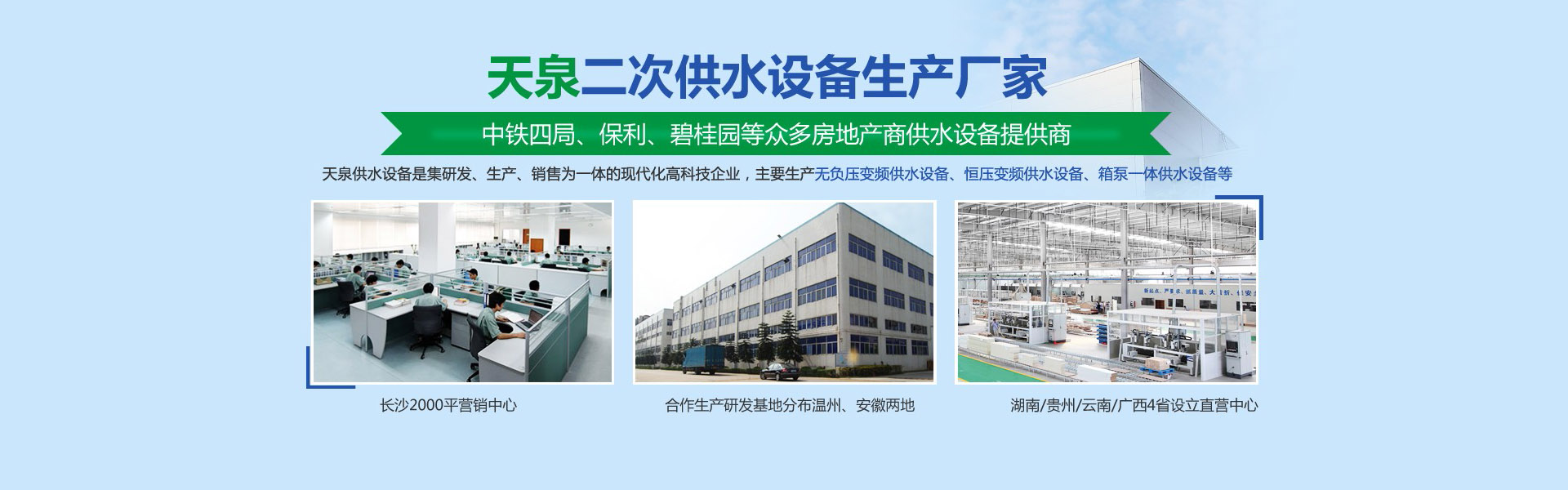 長沙天泉供水設備有限公司位于長沙雨花經濟開發(fā)區。公司是集研發(fā)、生產、銷售為一體的現代化科技型企業公司生產銷售的產品有無負壓變頻供水設備、自來水加壓泵站、變頻調速恒壓供水設備、智慧標準泵房、智慧水務、一體化預制泵站、循環(huán)水系統工程等二十幾大類別。